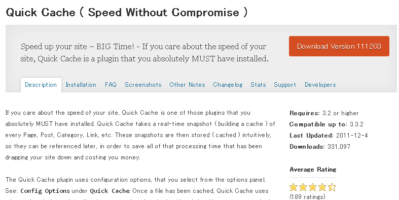 まずはWordPress公式サイト内にあるQuick CacheのダウンロードページからzipファイルをPCにダウンロードします。