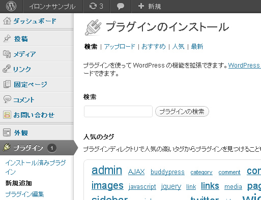 左メニューにある「プラグイン」項目「新規追加」に進むとこのような画面になっていると思います。