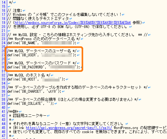このファイルをテキストエディタで開くと22行目付近からデータベース情報が載っています(ワードプレスのバージョンによっては違う場所にあるかもしれません)。