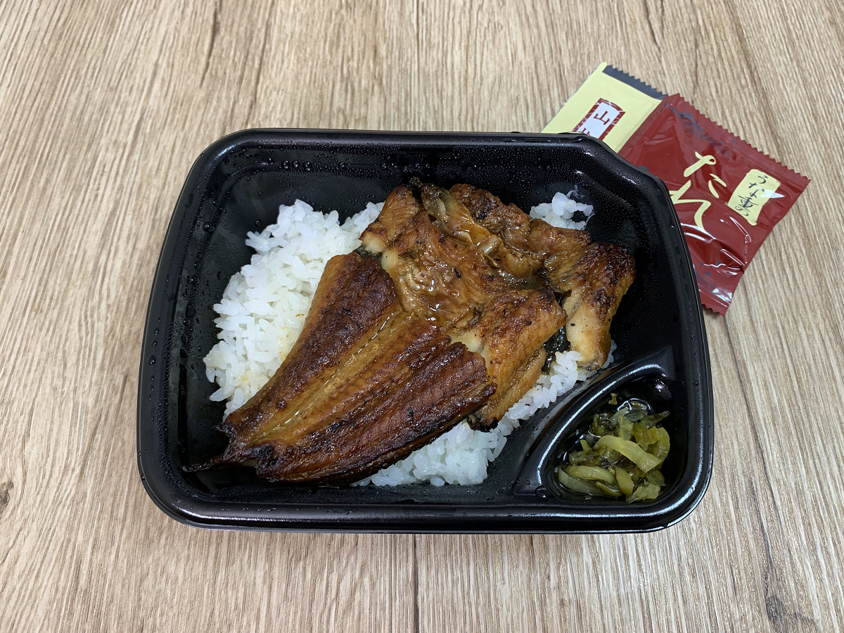 写真はうな重一枚盛の税込850円で、二枚盛1,310円、三枚盛1,870円の他、牛肉の小鉢や味噌汁つきのセットも販売されています。