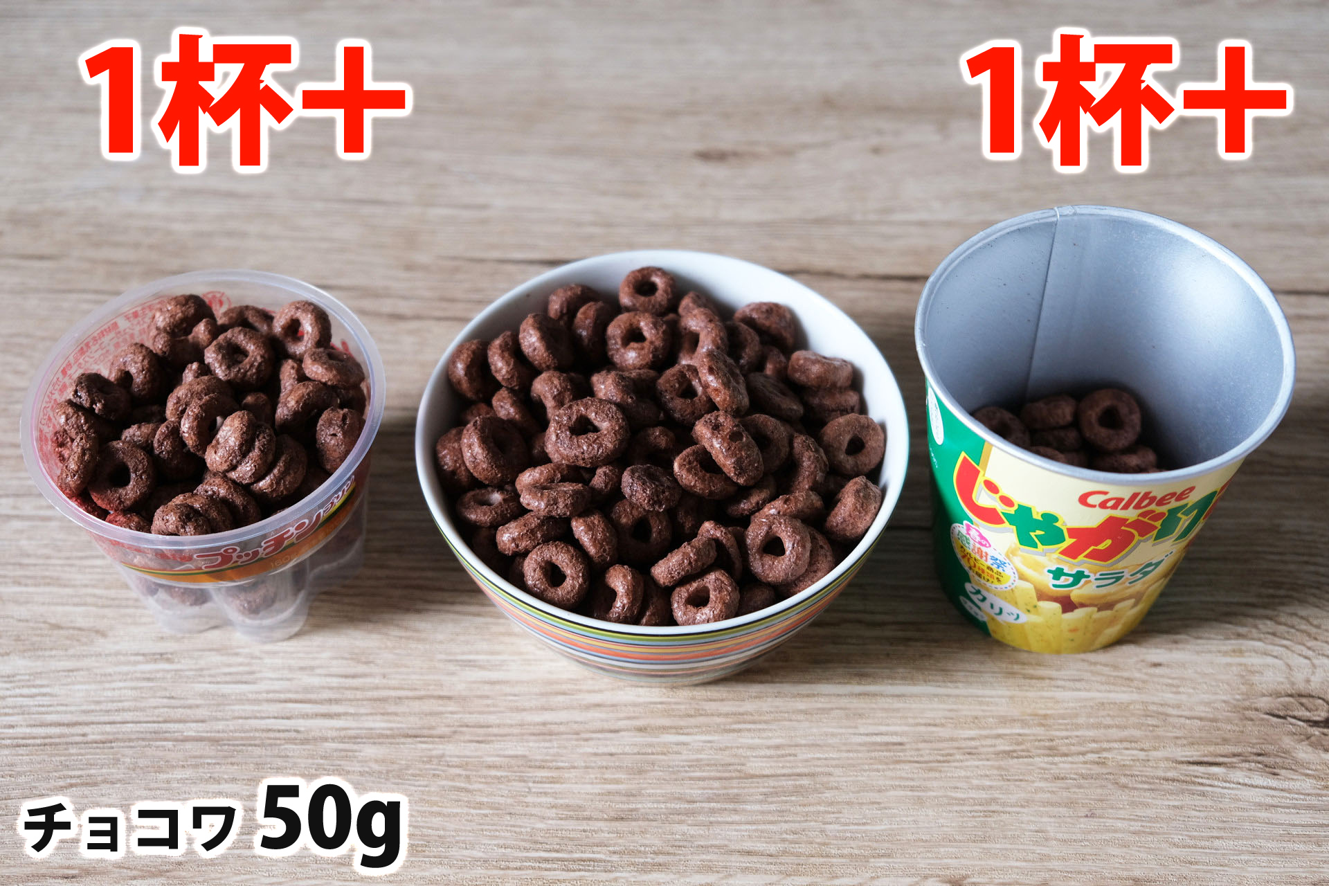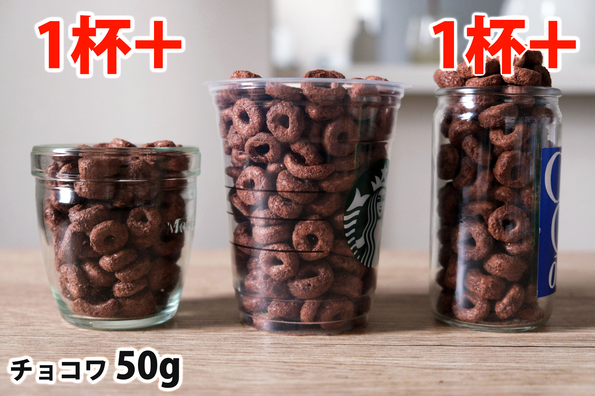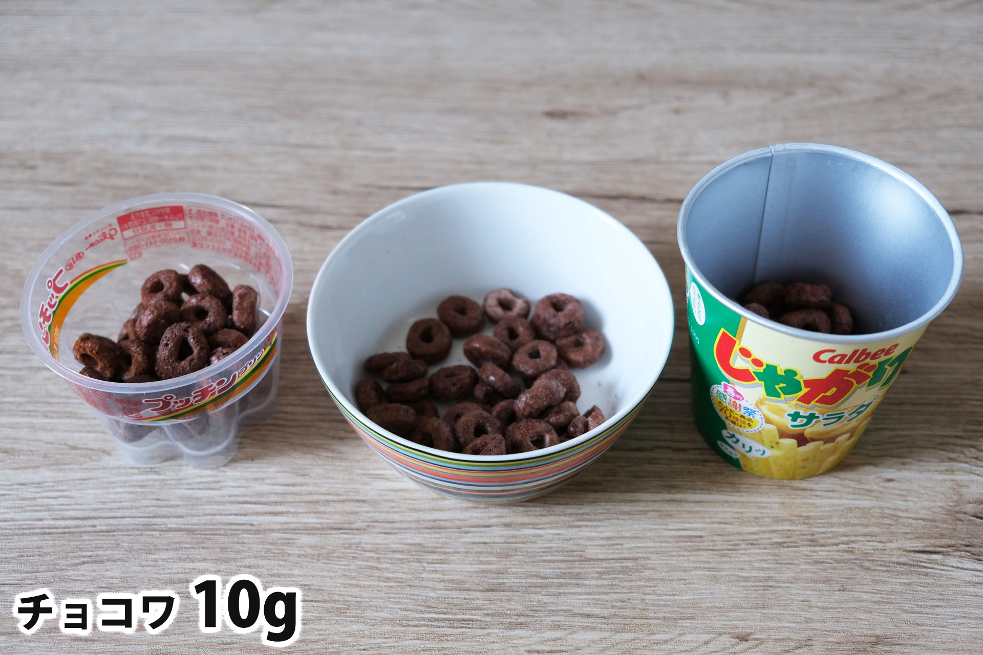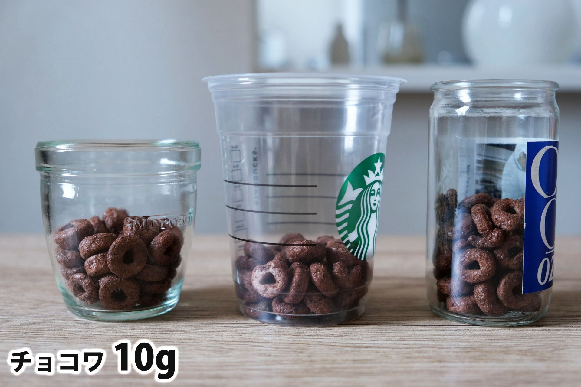以下ではどれくらいの量なのかを視覚的にイメージしやすいよう、各グラムごとのチョコワをよく目にする容器に入れてみました。