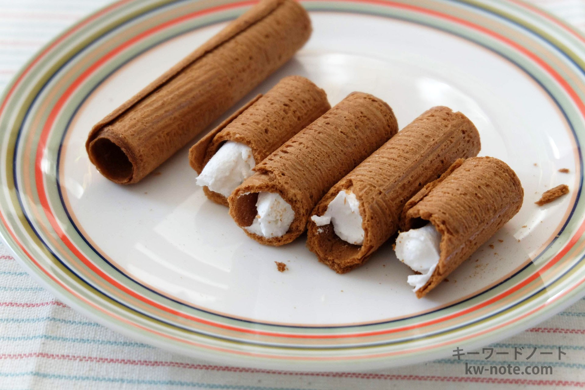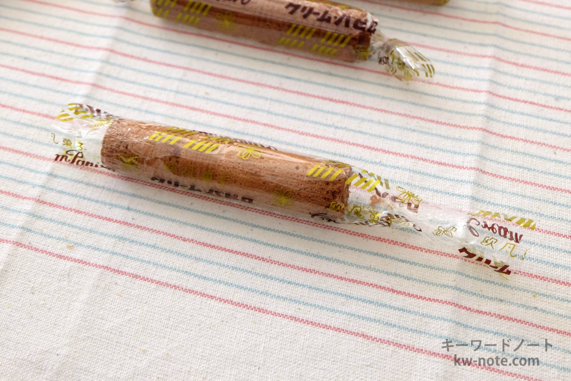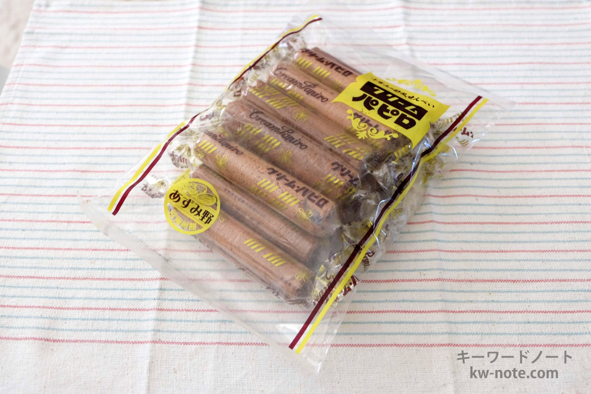 長野県安曇野市にある小宮山製菓が製造・販売するお菓子で、固く歯ごたえのある筒状の生地の中にクリームが入ったお菓子です。販売を開始したのは1966年(昭和41年)12月。
