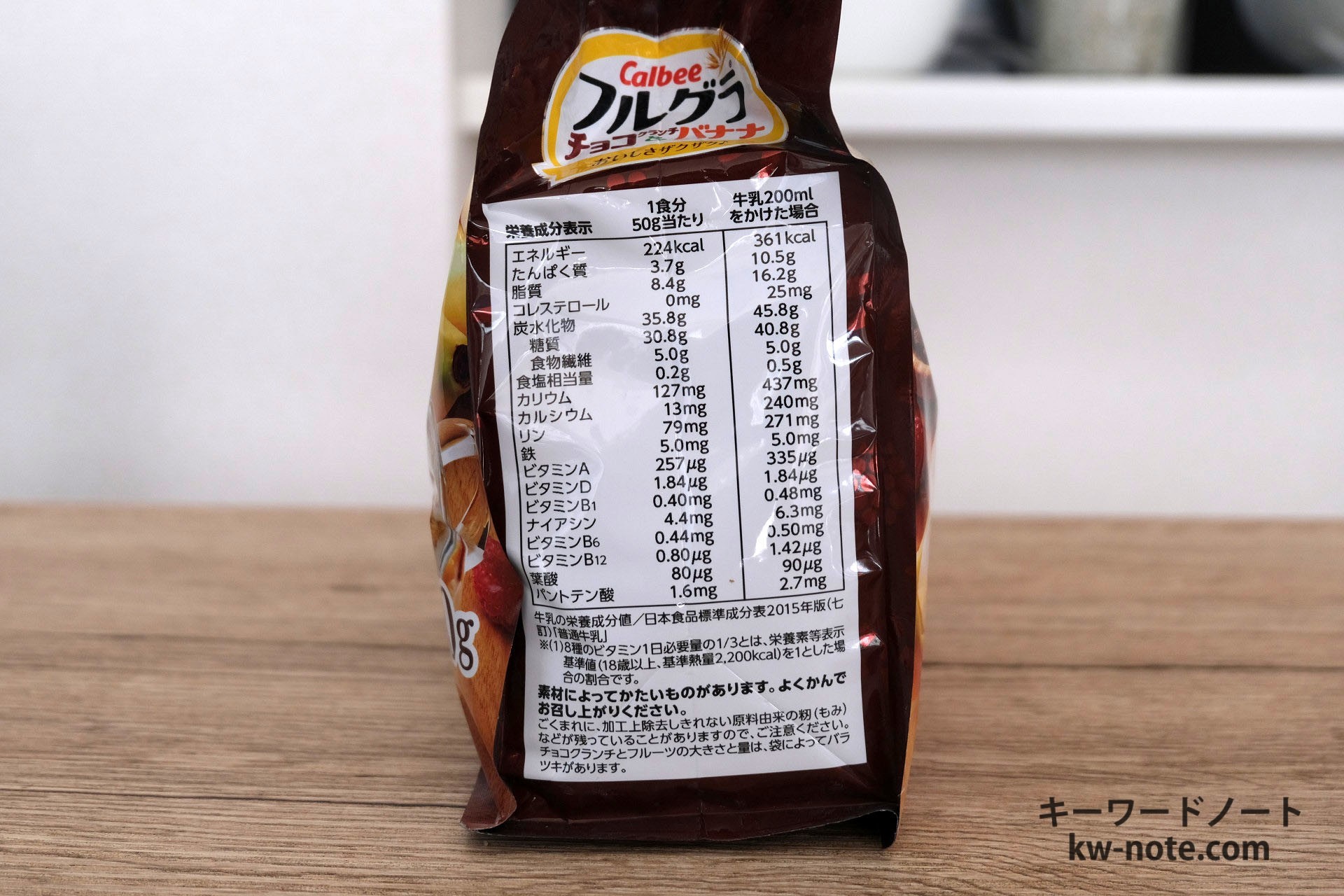 まず「フルグラ チョコクランチ&バナナ」1食分はどれくらいなのかというと、パッケージには「栄養成分表示 1食分50g当たり」と書かれていますので、フルグラ チョコクランチ&バナナは1食あたり50グラムが目安です。