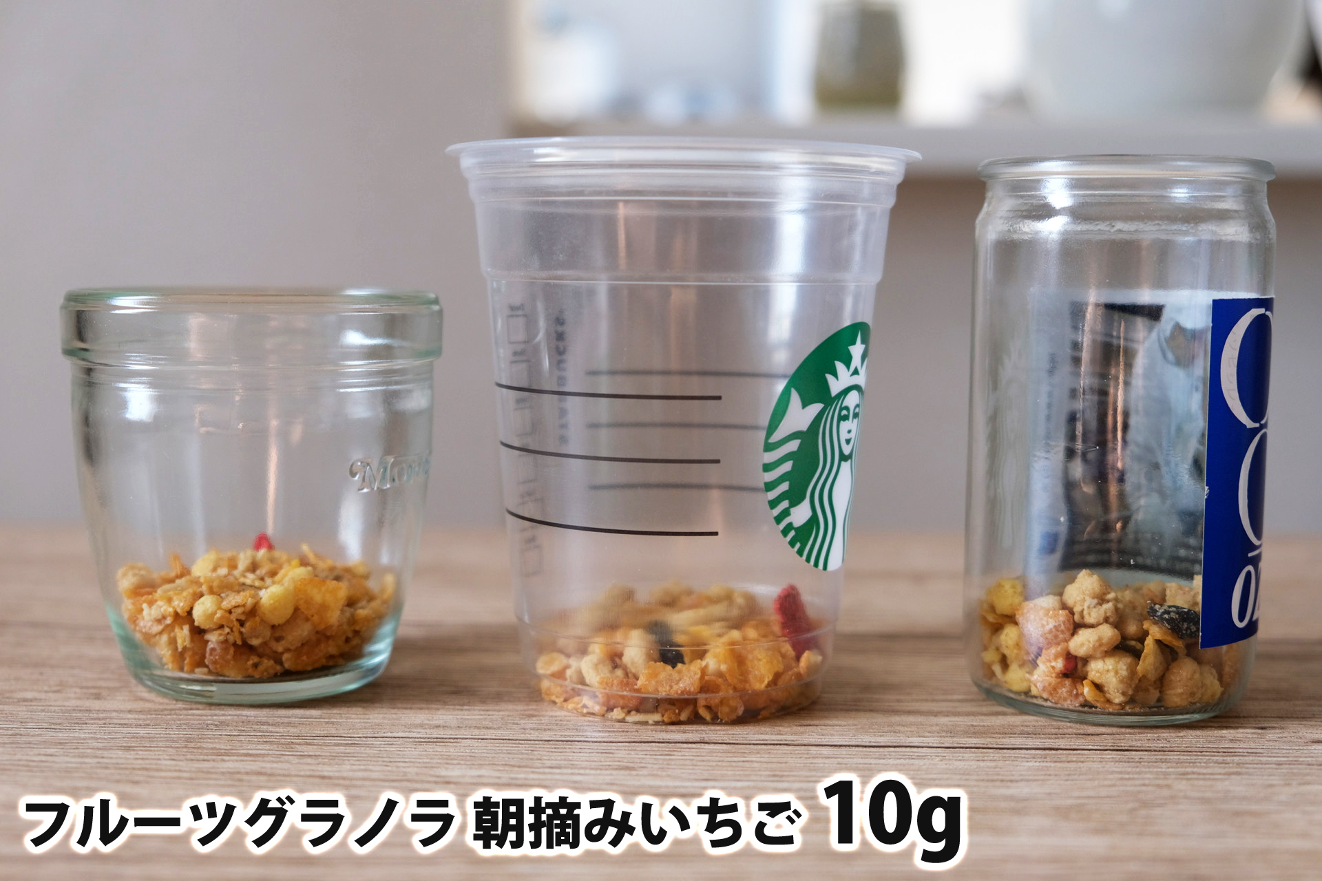 • フルーツグラノラ 朝摘みいちご10gを「モロゾフ」「トールサイズのカップ」「ワンカップ大関」に入れた時の目安