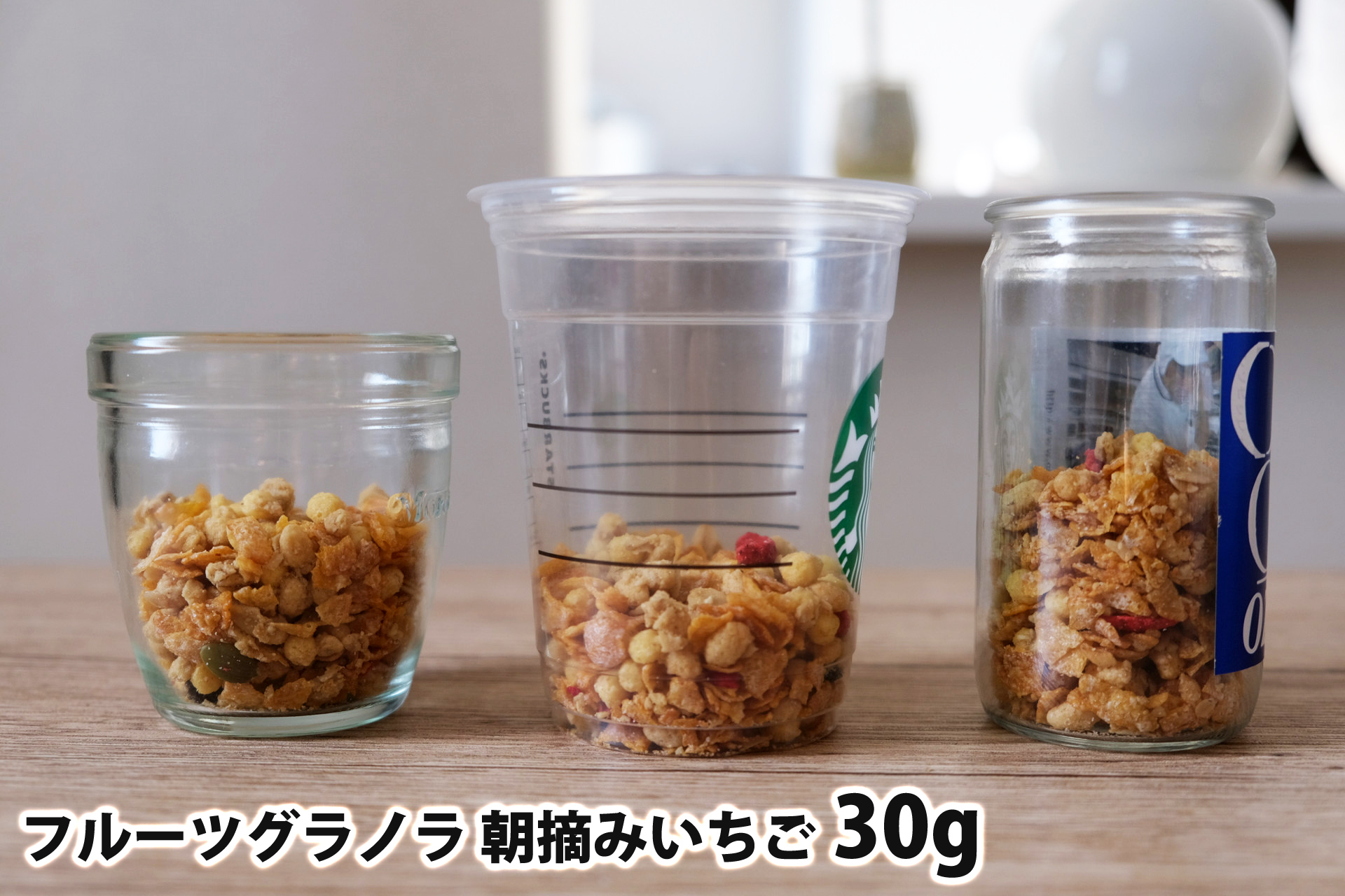 フルーツグラノラ 朝摘みいちご30gを「モロゾフ」「トールサイズのカップ」「ワンカップ大関」に入れた時の目安