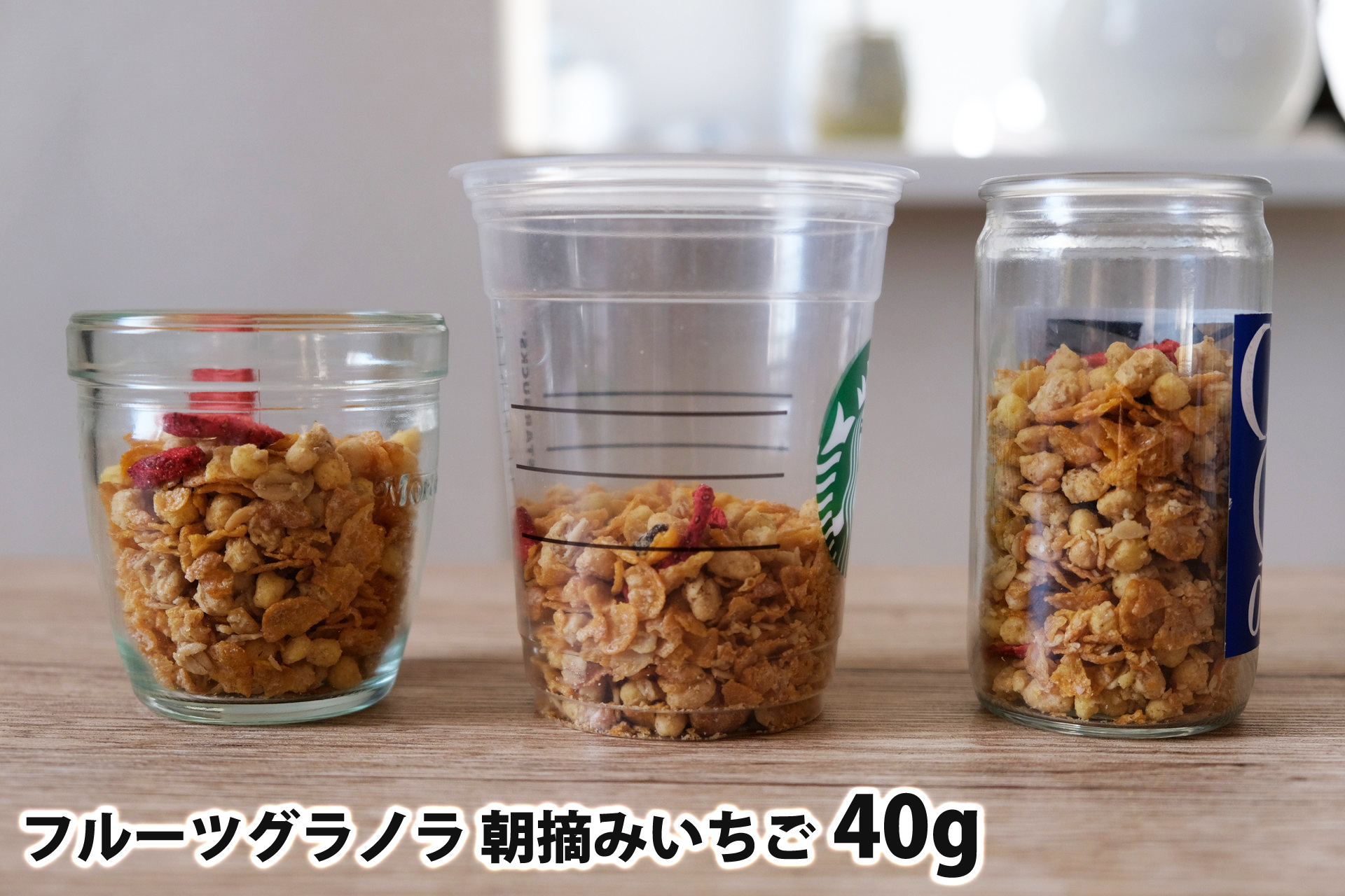 • フルーツグラノラ 朝摘みいちご40gを「モロゾフ」「トールサイズのカップ」「ワンカップ大関」に入れた時の目安