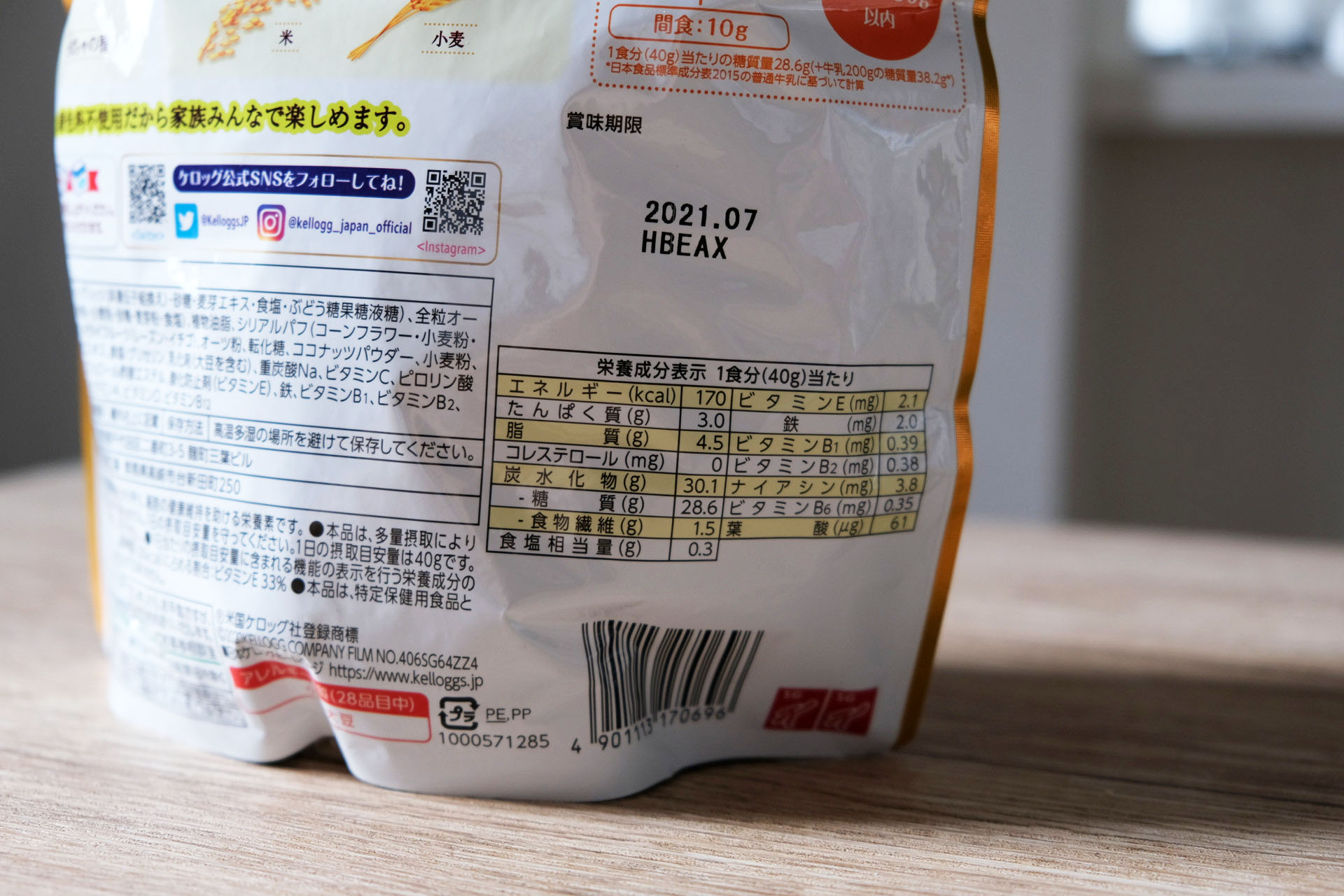 パッケージには「栄養成分表示 1食分(40g)当たり」と書かれていますので、フルーツグラノラ 朝摘みいちごは1食あたり40グラムが目安とされています。