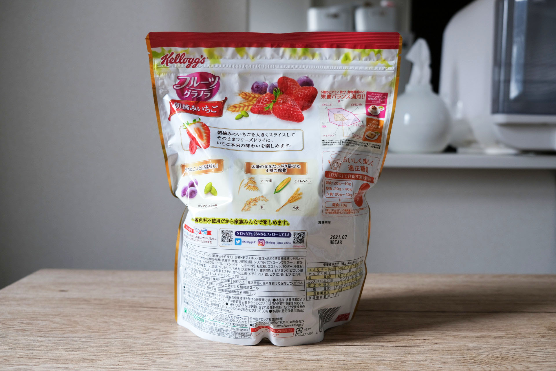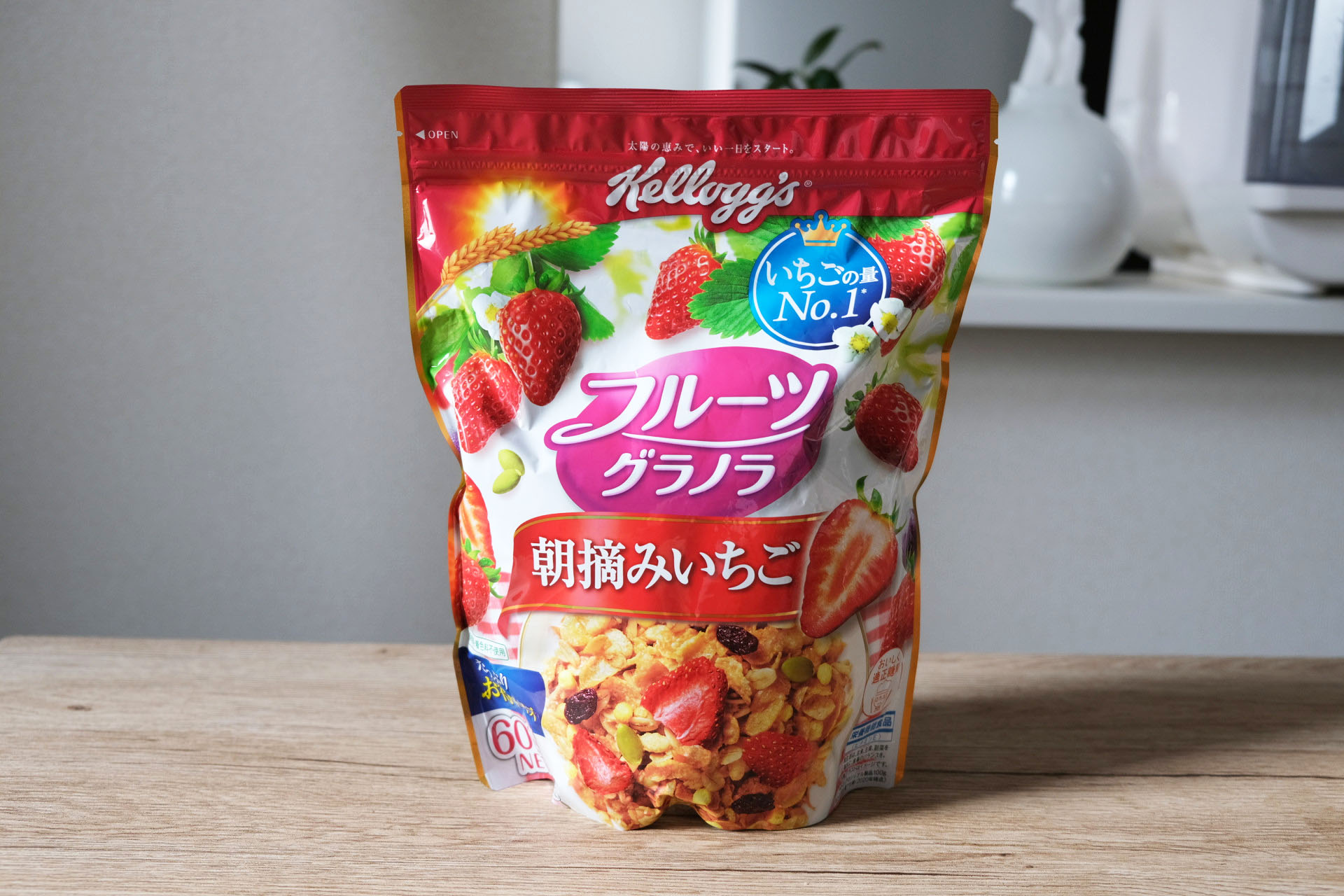 ケロッグから販売されているシリアル「フルーツグラノラ 朝摘みいちご」1食分の量はどれ位なのかと、各グラムごとの分量の目安、牛乳・ヨーグルト・豆乳をかけた時の栄養成分とともにまとめました。