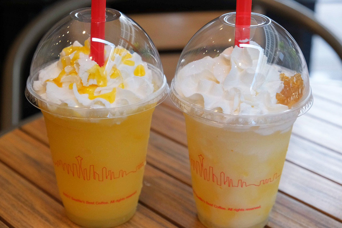 上の写真は左から「フルーツクーラ マンゴー」と「ジャバクーラ ゆず」で、ホイップクリームがトッピングされ具材がのっています。