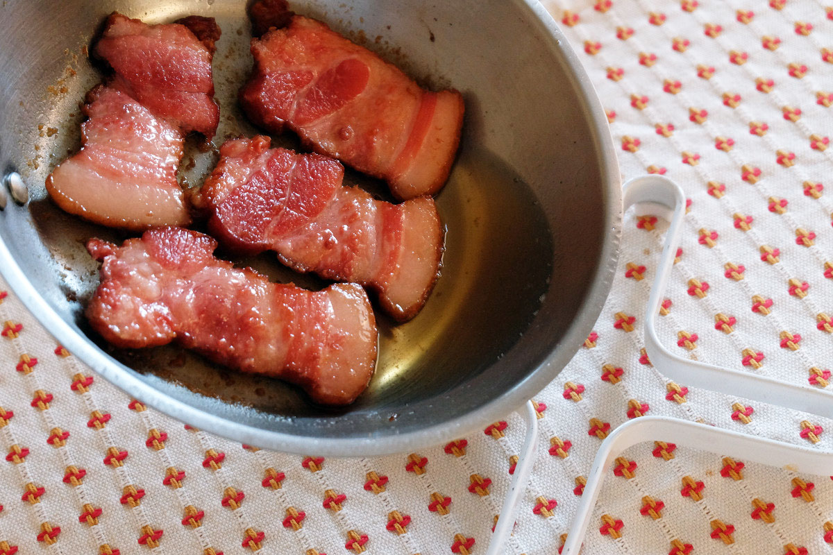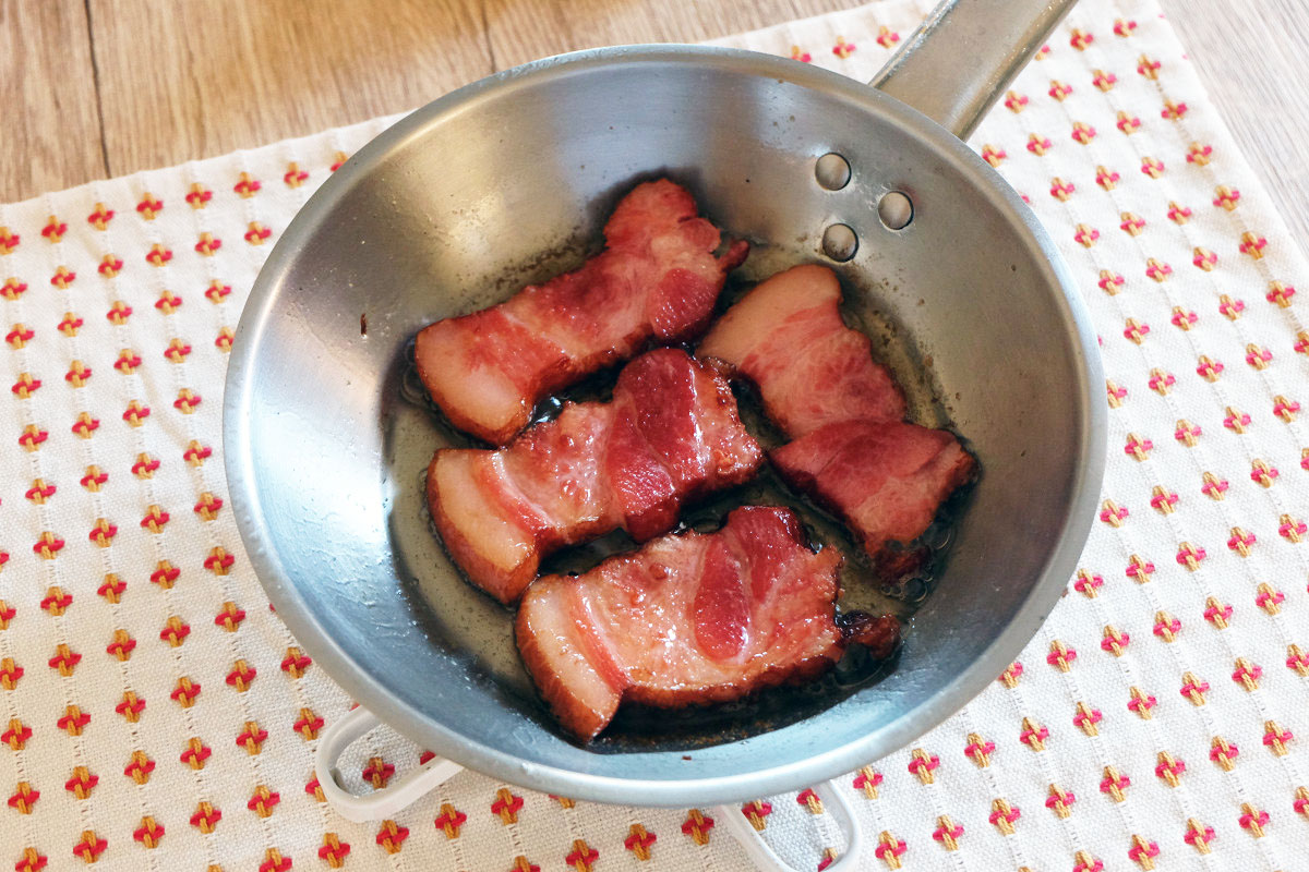 脂肪分が多く他のベーコンと比べ、焼くとかなりの脂が出てくるのが特徴ですが、通常のベーコンと同じ様に焼いてそのまま食べたり、パスタや炒めものなどに使えます。