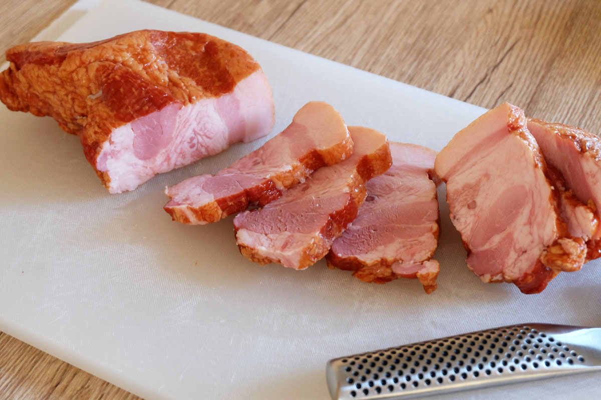 スライスしてみるとショルダーベーコンとは違い肉々しいというか、普通の肉に近い印象。