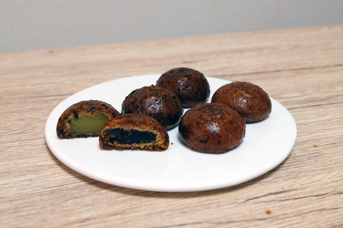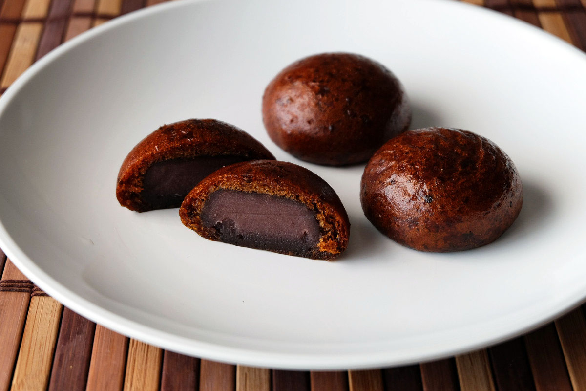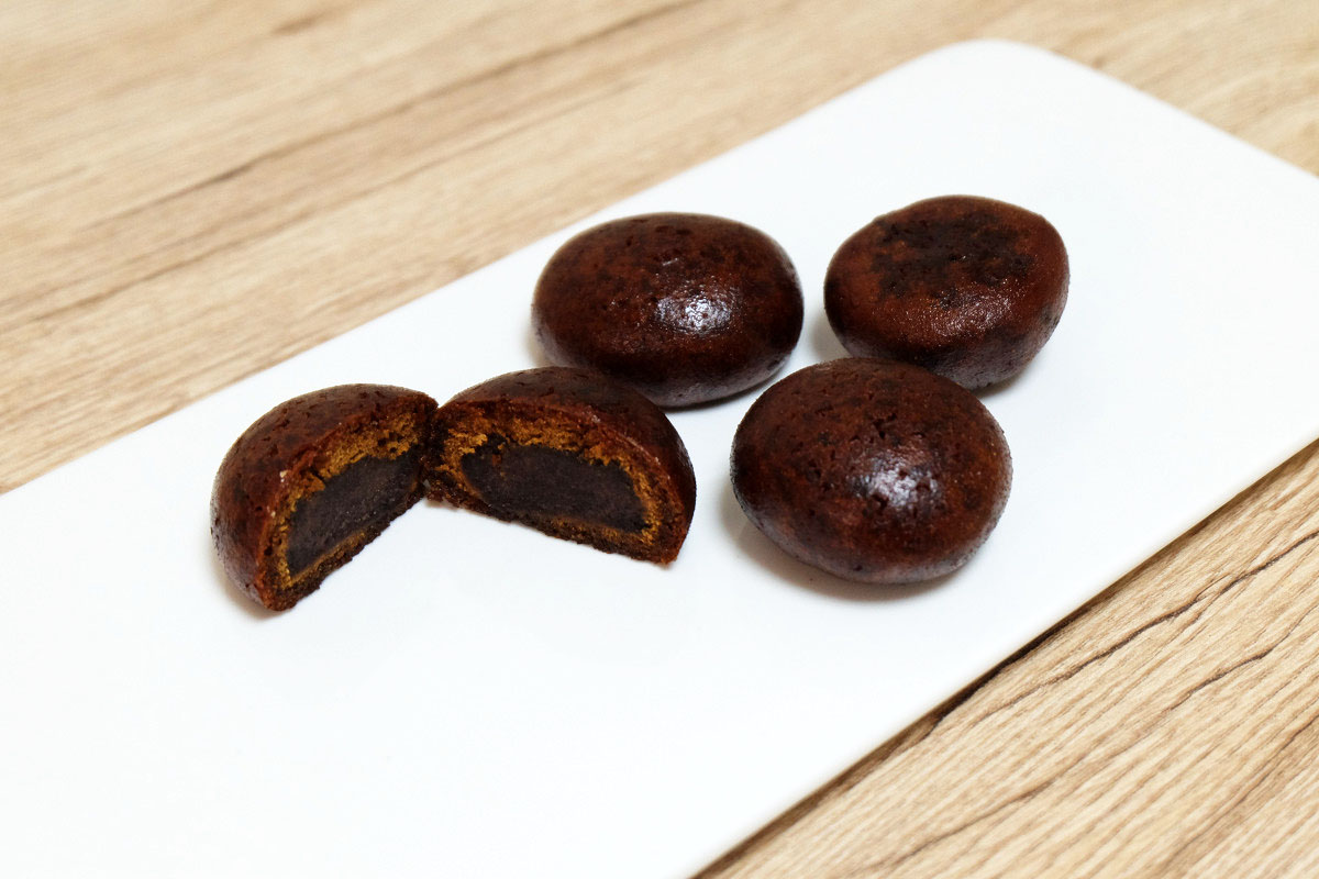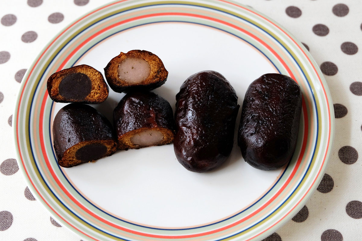元祖である「あくつ屋」のかりんとう饅頭は、こしあんを黒糖入りの饅頭生地で包み込み蒸し、油で揚げて作られます。