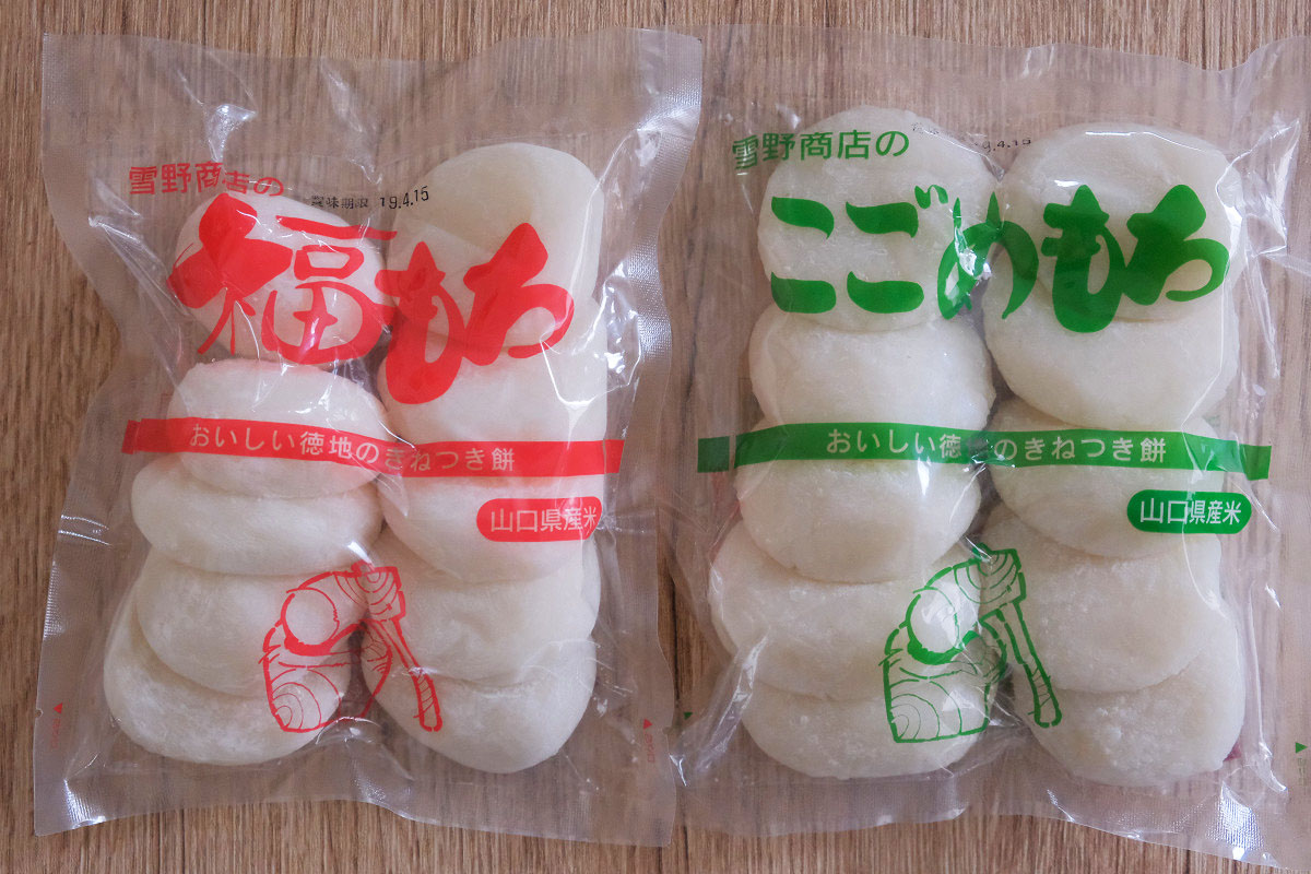 上の写真は左がもち米100%の餅、右がもち米とお米(うるち米)で作ったこごめ餅で、ともに山口県のスーパーで購入したものです。