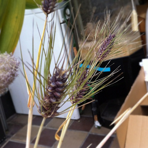 紫に色づいたもち麦の穂の写真です。この色はもち性裸麦の特徴です。