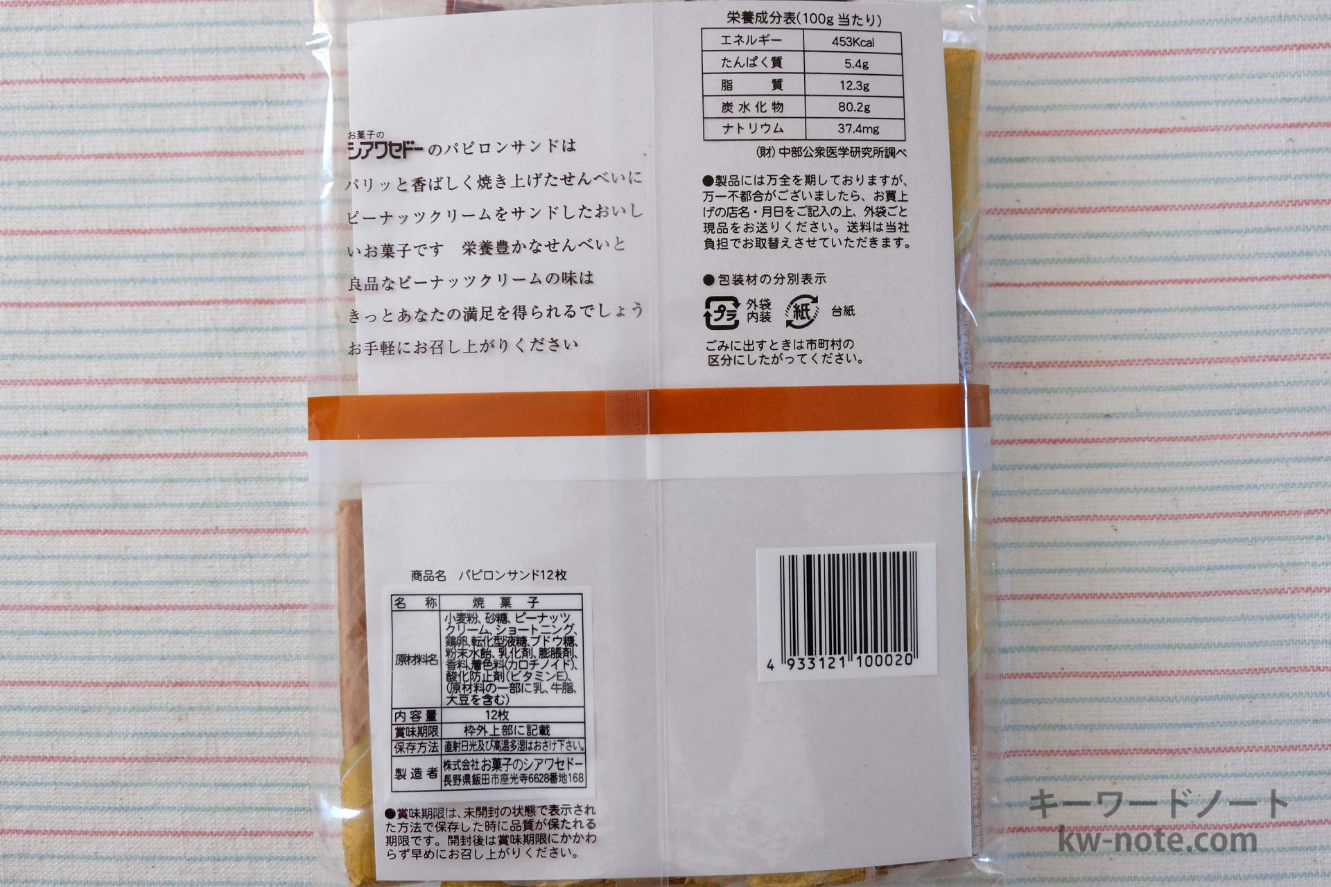| 原材料名 | 小麦粉、砂糖、ピーナッツクリーム、ショートニング、鶏卵、転化型液糖、ブドウ糖、粉末水飴、乳化剤、膨張剤、香料、着色料(カロチノイド)、酸化防止剤(ビタミンE)、(原材料の一部に乳、牛脂、大豆を含む) |