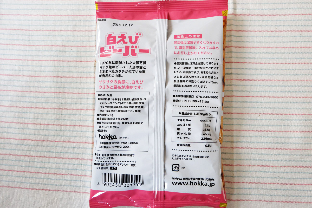 写真は2016年9月に金沢市内のスーパーにて200円前後で購入した白えびビーバーです。