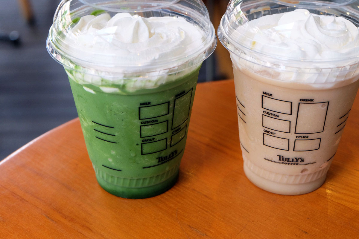 細かく砕かれた氷の入った抹茶、ロイヤルティーのフローズンの上にはホイップクリームが渦上にトッピングされています。
