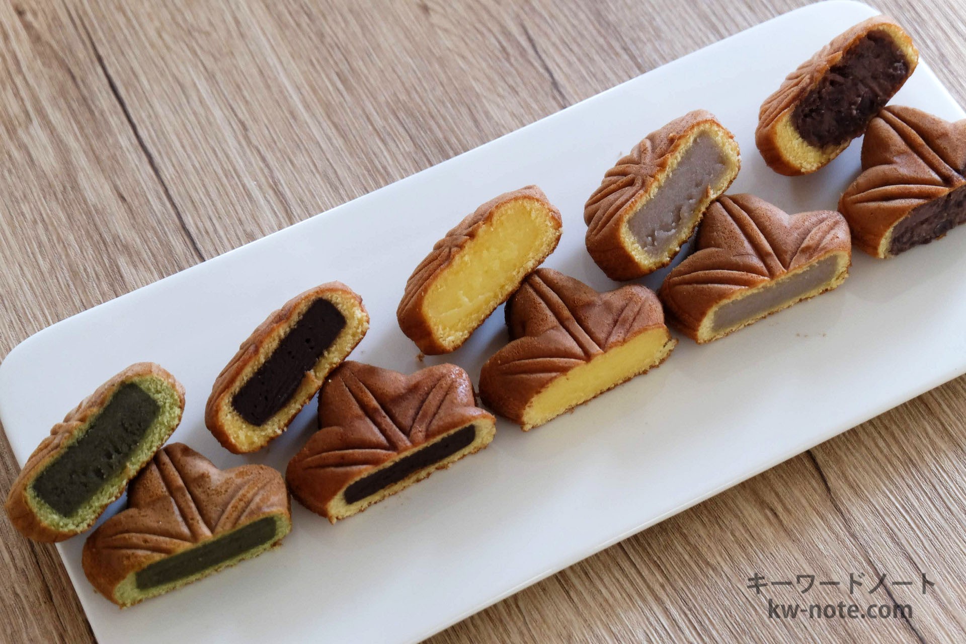 もみじ饅頭がふわっとしたよく使われる和菓子の生地なのに対し、桐葉菓は伸びのあるモチっとした生地、中の小豆も食感が全く異なります(もちろんもみじ饅頭も美味しいですが)。