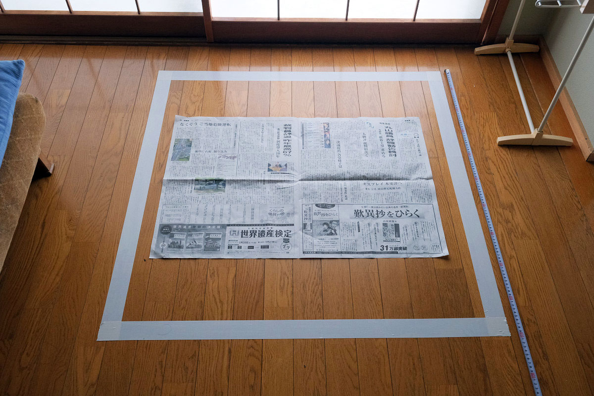 より面積のイメージが付きやすいよう、一般的な大きさの新聞紙を広げて真ん中に起きました。