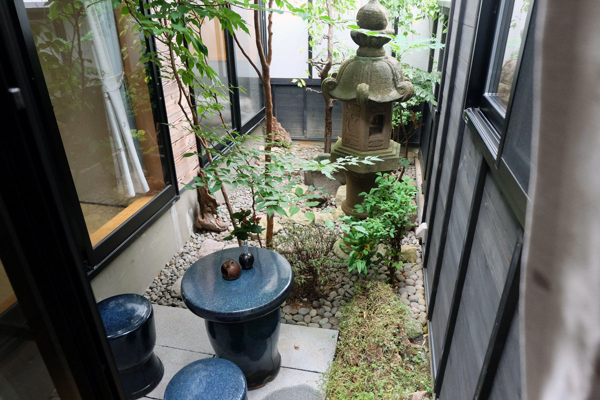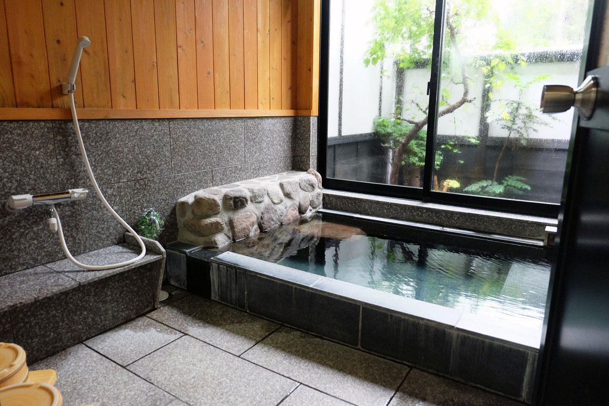 源泉掛け流しの風呂と中庭付きのお部屋でした。
