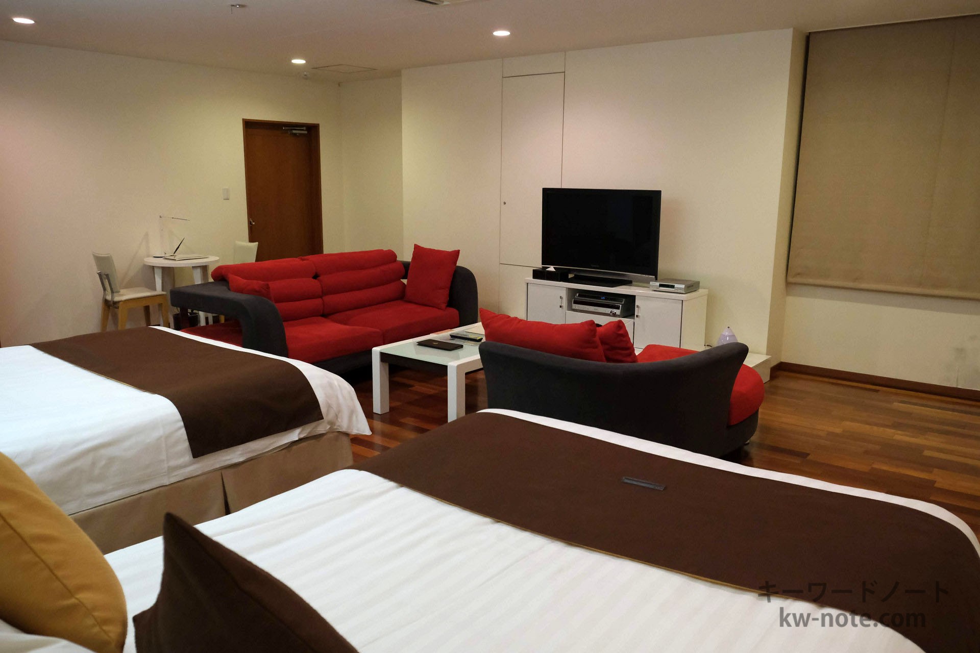 ホテルでいうとリゾートホテルで2~4人向けの部屋で、4人だとかなりゆとりのある利用が出来、5人でもそれほど狭さを感じない広さです。