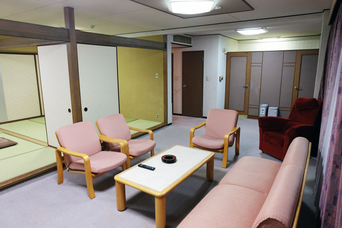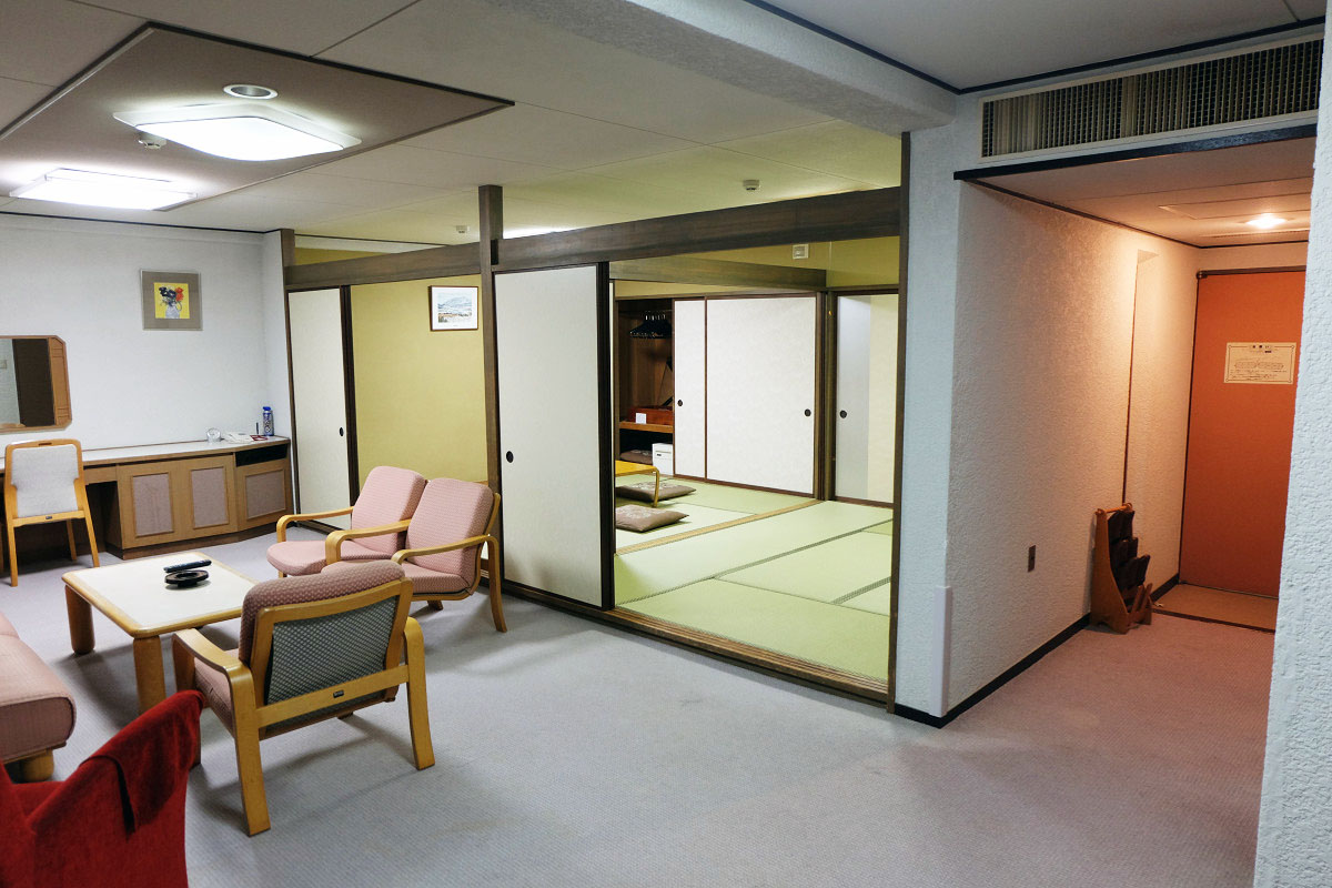 伊豆の修善寺、丘を登った場所にあるホテルで、和室2部屋に洋室のリビングの間取り。