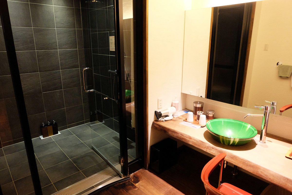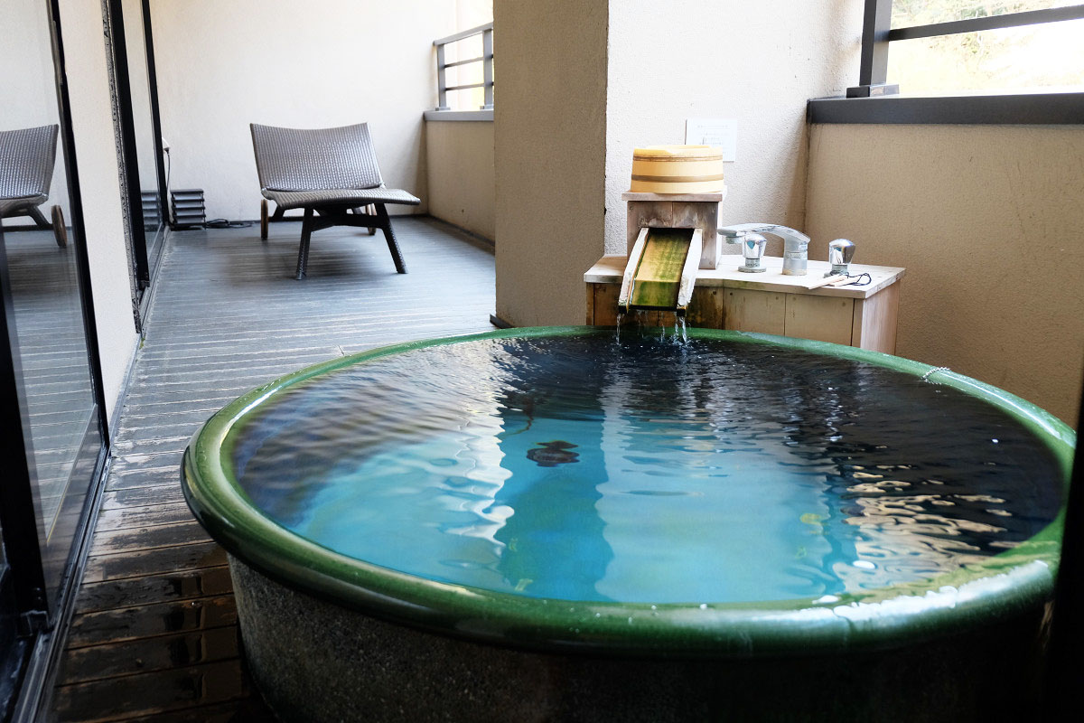 お風呂からはライトアップされた緑の景色が広がっていて、建物の下に流れている川の流れの音を聞きながら入る事ができます。