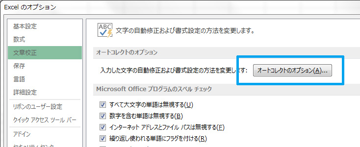 Excelのオプションが開くので左メニューにある「文章校正」を選択して右のコンテンツ部分に表示される「オートコレクトのオプション」ボタンをクリック。