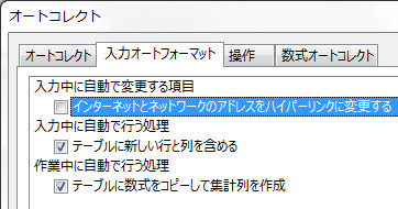 オートコレクトの画面が開くので「入力オートフォーマット」のタブを選択して「インターネットとネットワークのアドレスをハイパーリンクに変更する」の項目のチェックを外してOKボタンをクリック。