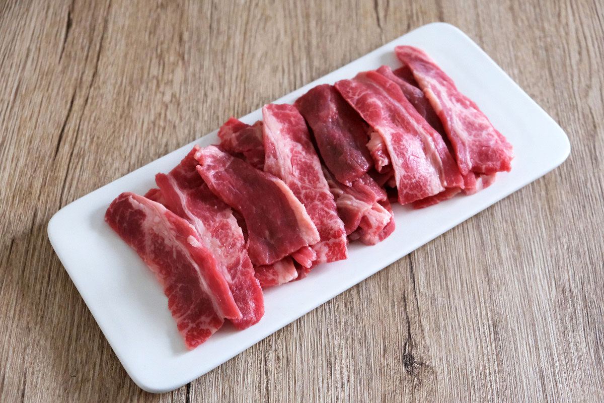 今回写真で使った写真は「楽天西友ネットスーパー」で購入した、100g当たり197円のアメリカ産「牛肉ばらカルビ焼肉」です。