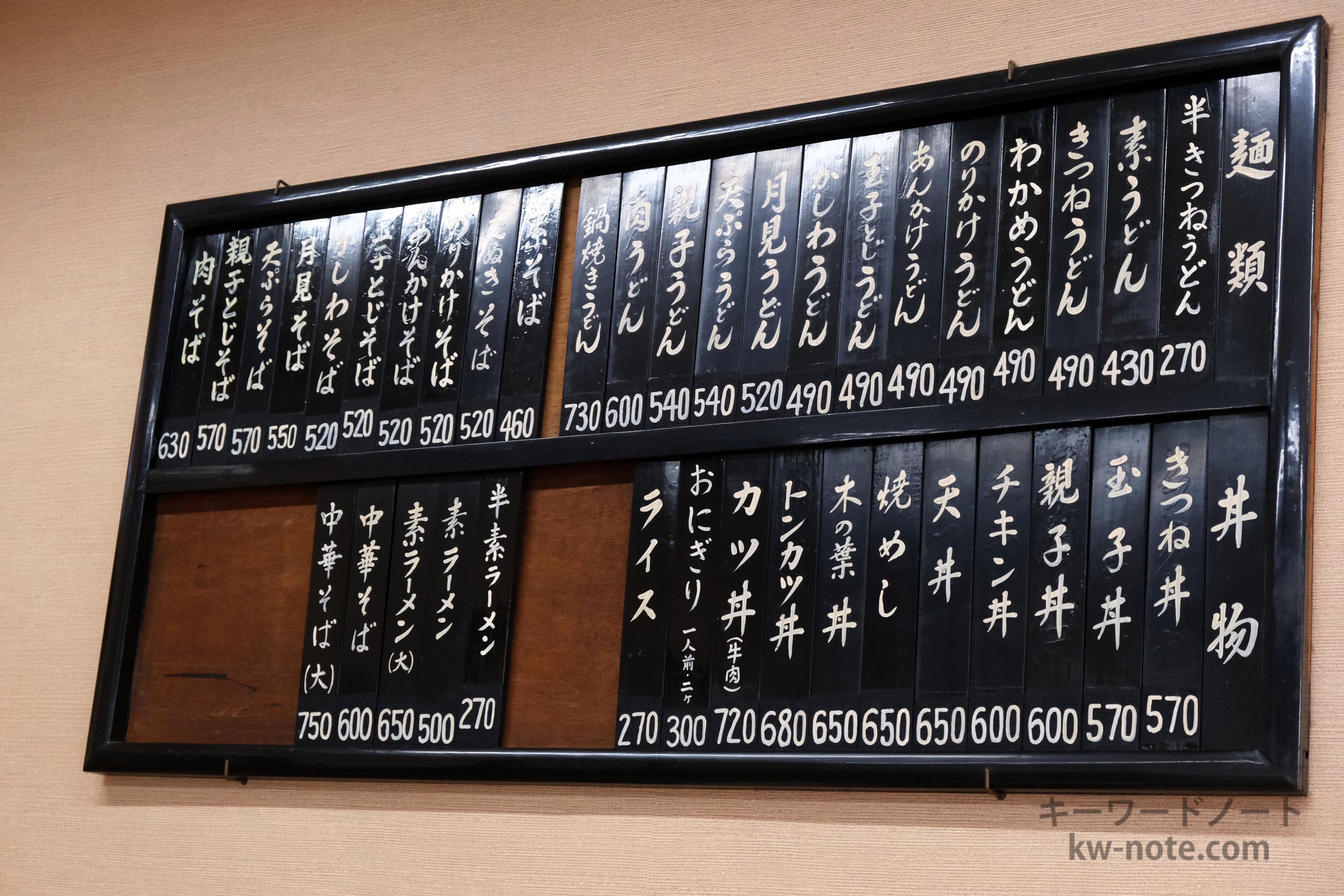 昔ながらの食堂らしくラーメンの他、丼モノや蕎麦、うどんなどがあり、500~600円前後とありがたい価格帯です。