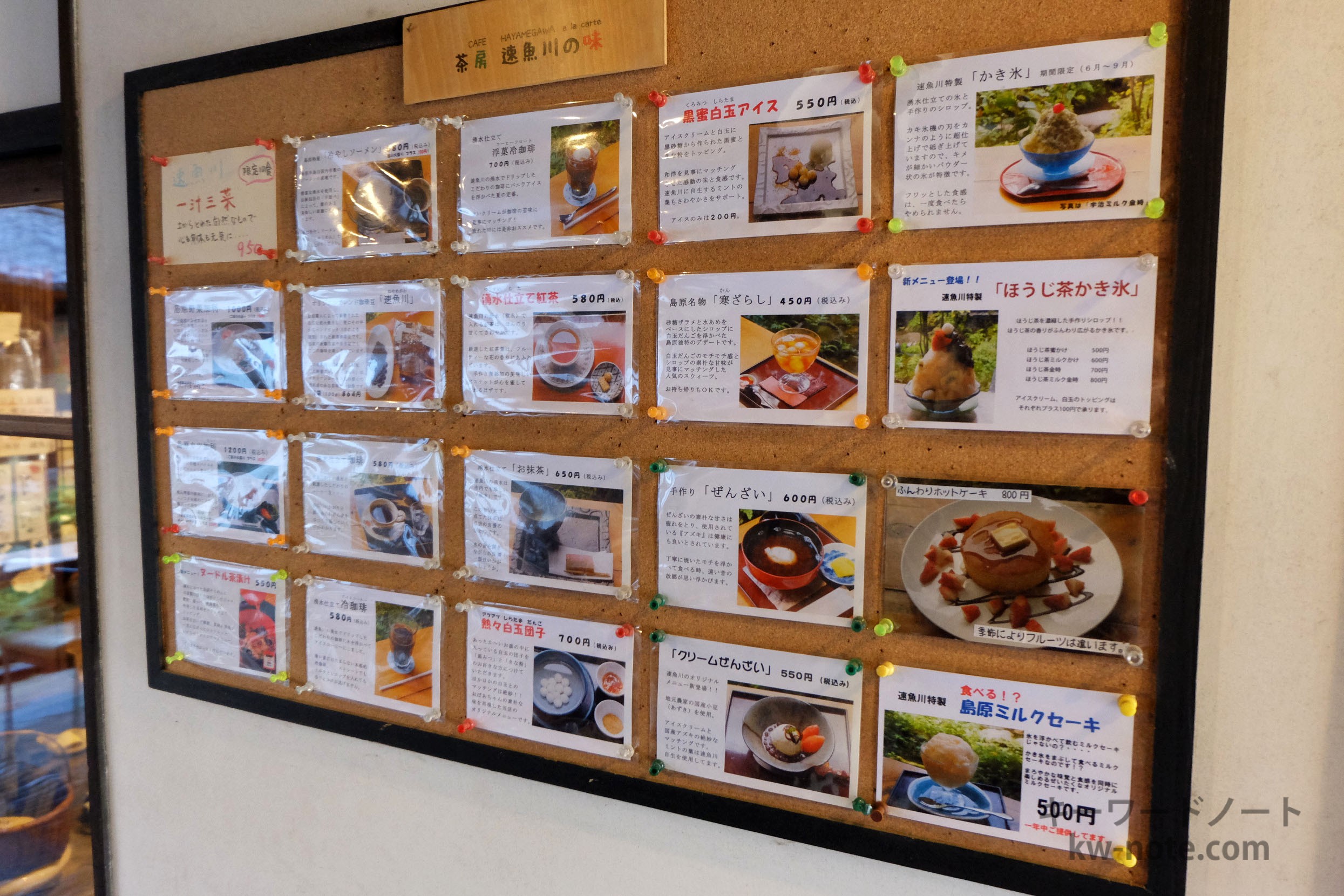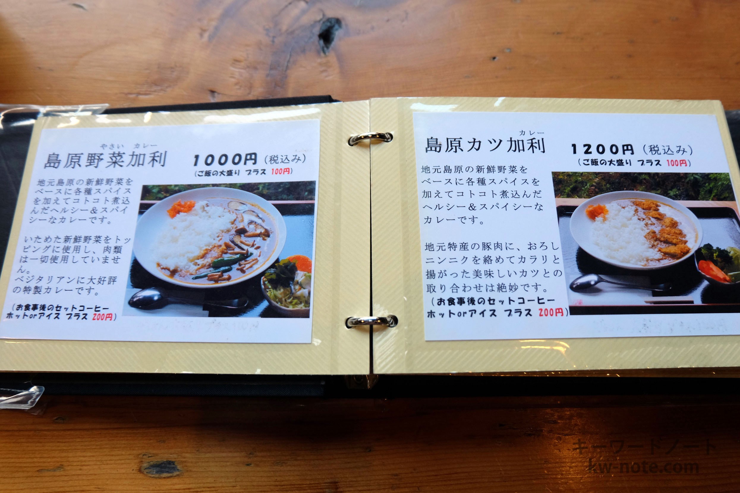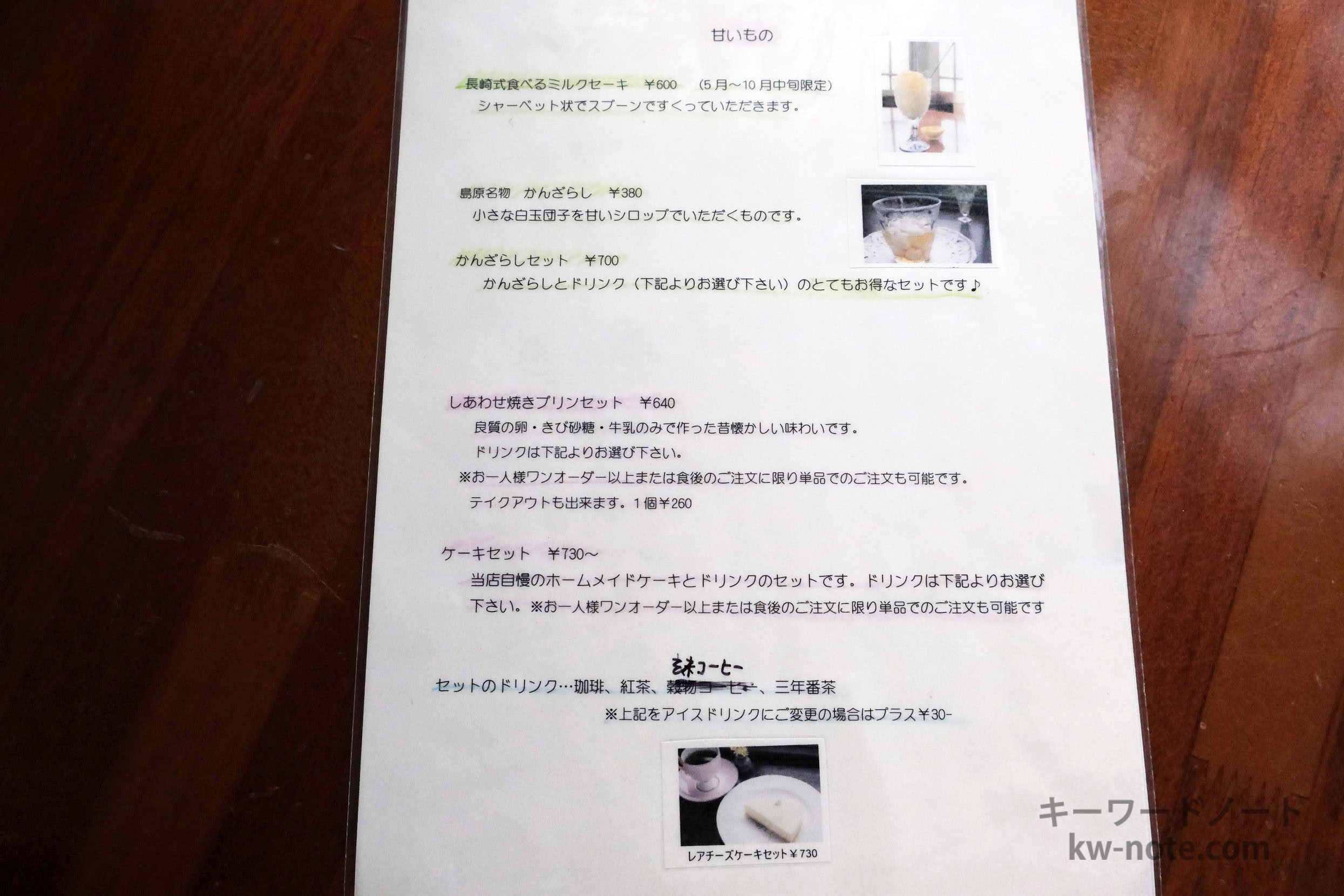 島原の湧き水を使った郷土料理・当地グルメである「かんざらし」や、「食べるミルクセーキ」とも言われる長崎のミルクセーキなど甘味の他、本格コーヒー、カレーや素麺などが食べられます。