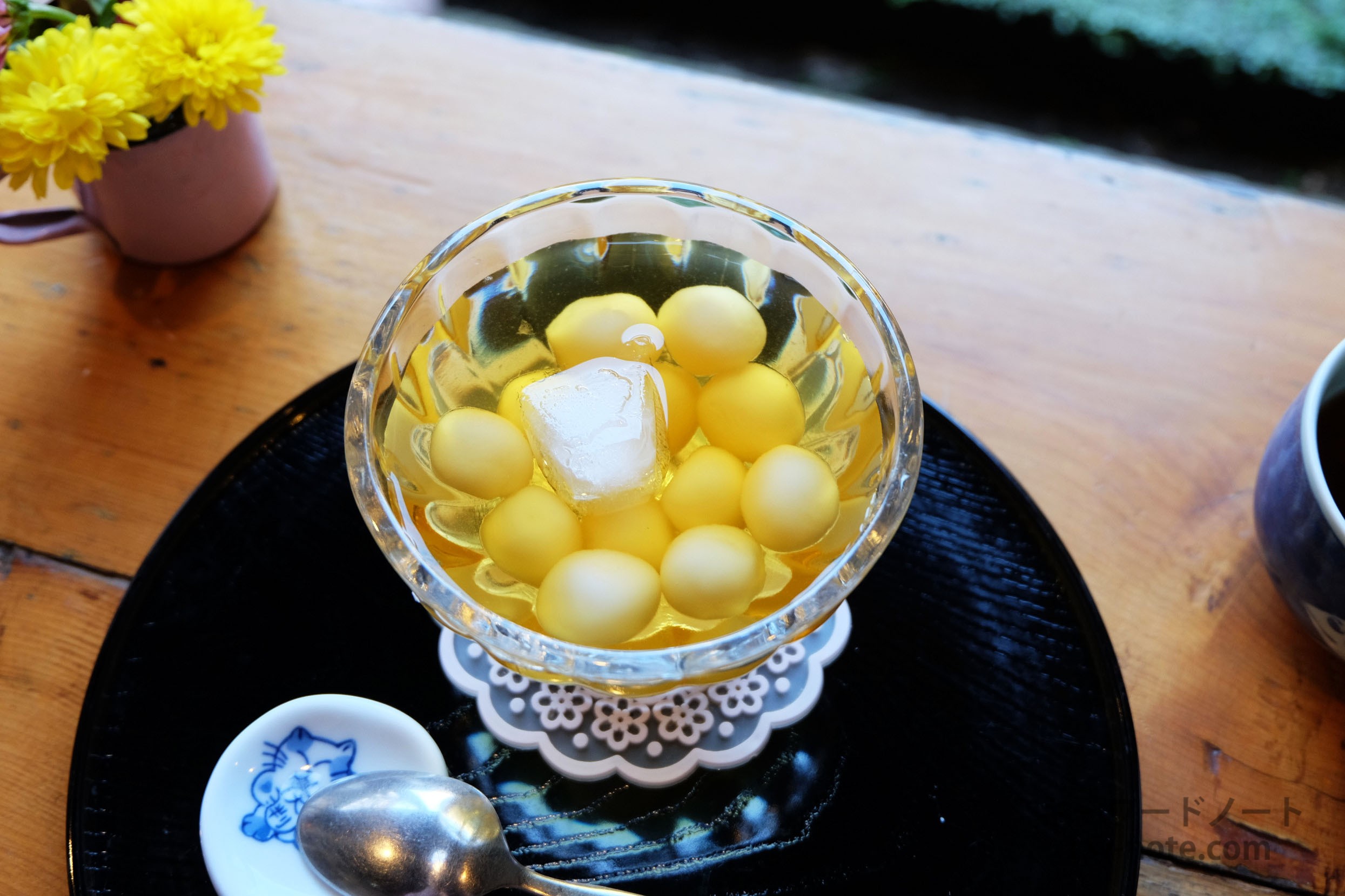 かんざらしは島原の郷土料理・ご当地グルメで、ニッキの香りのする蜜に小さめの白玉を入れた、涼し気な見た目も楽しめる和スイーツ。