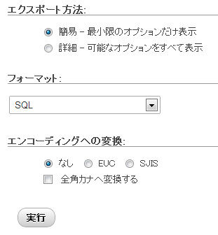 上の画像のような画面になったらフォーマットを「SQL」にしてエンコーディングへの変換は「なし」そして「実行」でSQLをダウンロードします。
