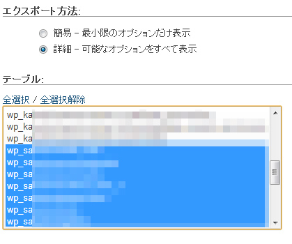 通常はこれでいいのですが、今回僕がエクスポートするデータベースには他のワードプレスでも使っている領域があるため、「エクスポート方法:」から詳細を選び、エクスポートしたい部分だけを選択して「実行」します。