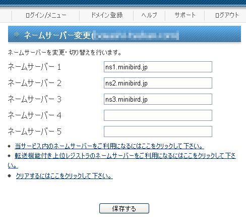1. ドメインを取得したサイトでミニバードのネームサーバー情報を登録