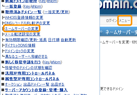 にログインして、ナビメニューにある「ログイン/メニュー」の「メニュー」をクリックしてポップアップ表示されたメニューにある「ネームサーバーの変更」に進みます。