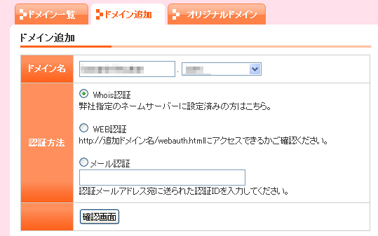 ですのでWhois認証にチェックを入れて「確認画面」ボタンを押します。