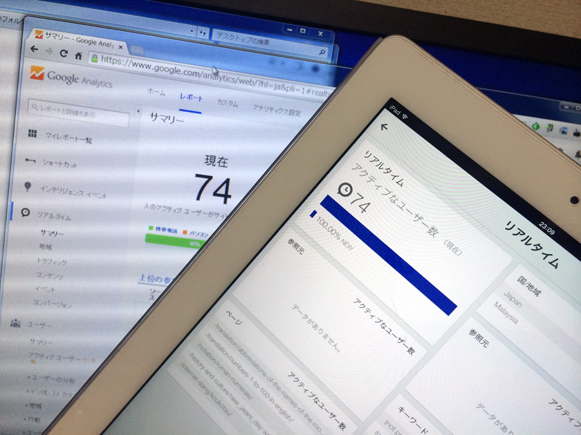 写真はこのサイトのリアルタイム解析画面を、PCサイトとスマートフォンアプリから見たときのものです。